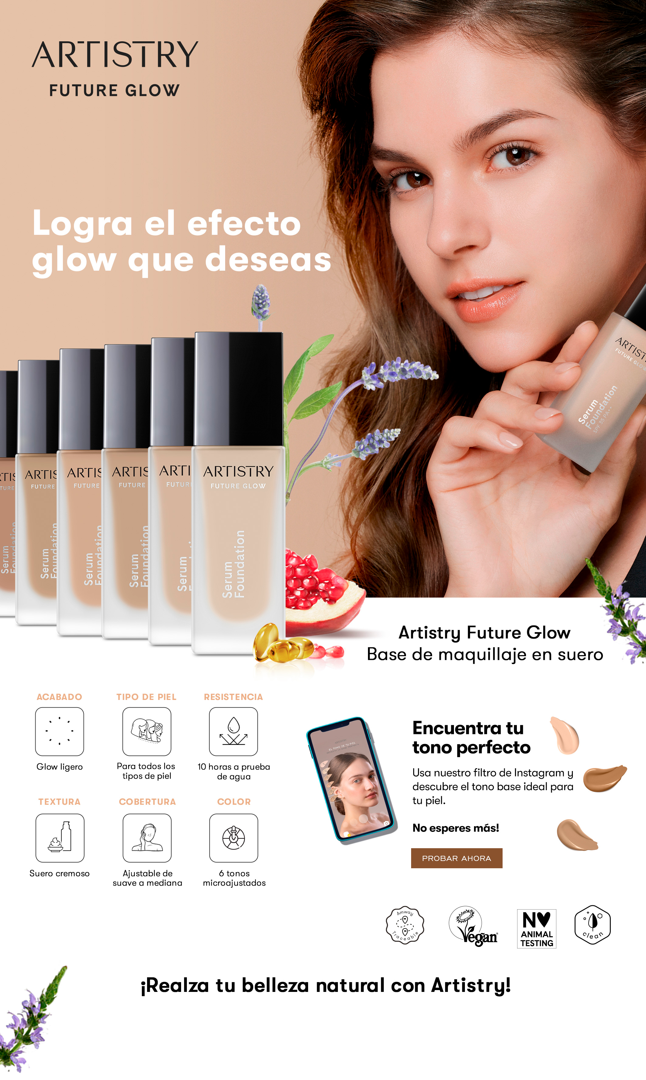 Enriquecida con la tecnología del suero de los liposomas fito-lamelares que encapsulan nutrientes de origen vegetal, usados por primera vez en un producto de maquillaje Artistry, para ofrecer beneficios clave para la superficie de la piel.