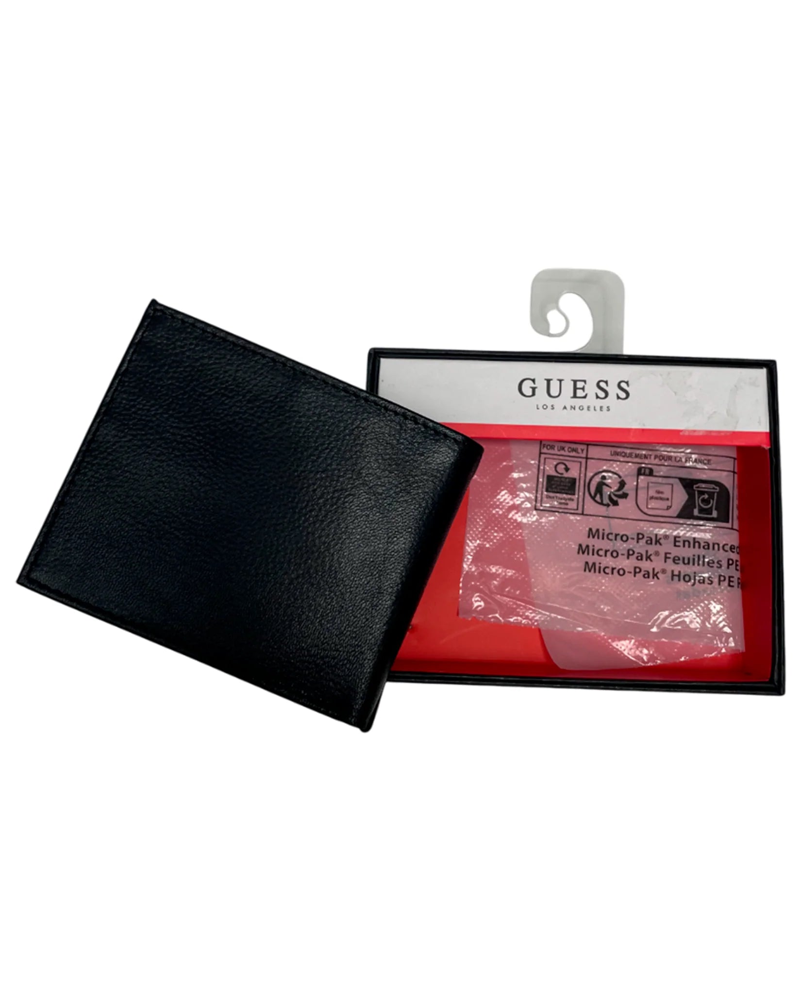Billetera Guess para hombre elaborada en cuero genuino color negro, con un diseño elegante y moderno. Incluye múltiples compartimentos para tarjetas y billetes, ideal para quienes buscan estilo, calidad y funcionalidad en un solo accesorio.